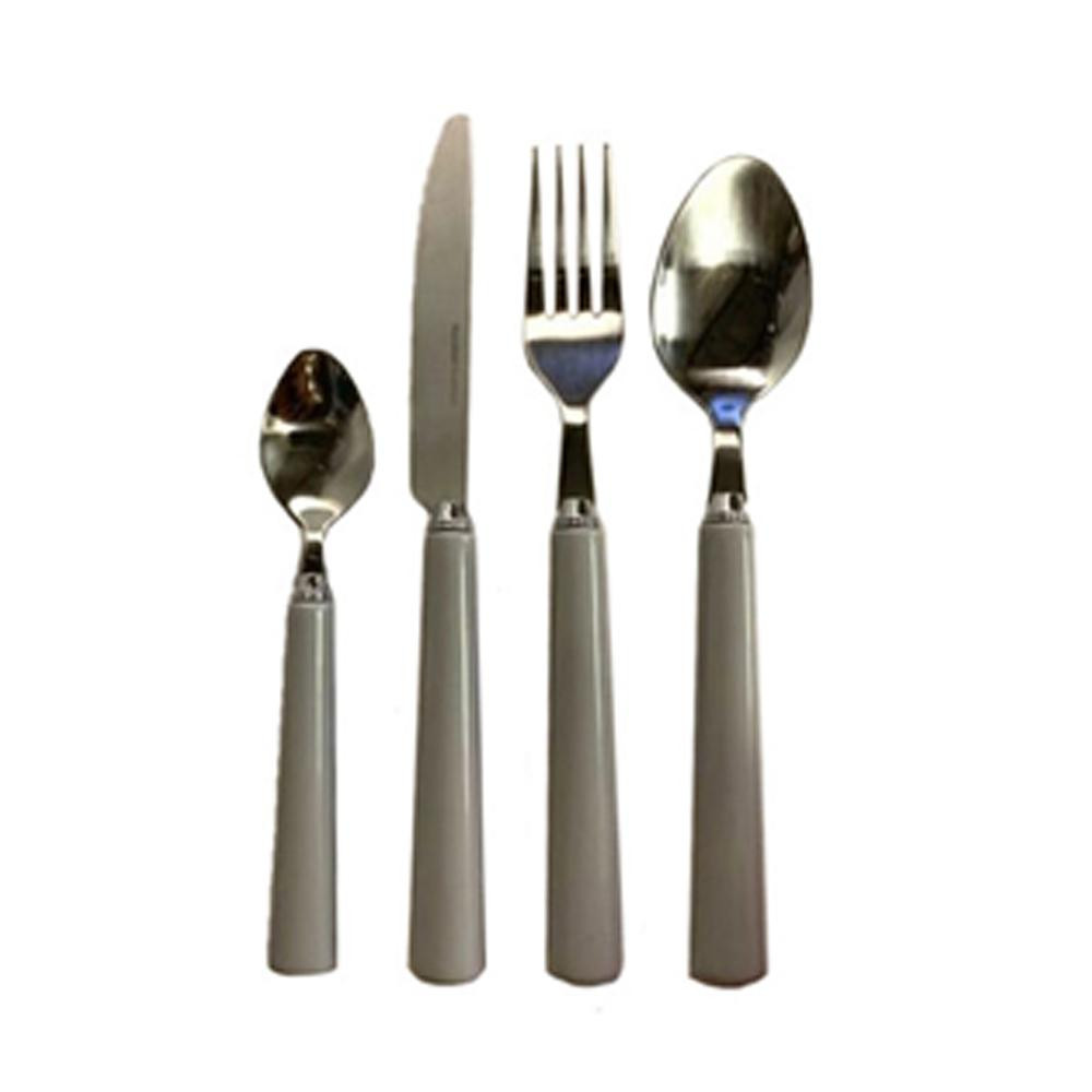 Een 16-delig bestekset bestaande uit 4 lepels, 4 messen, 4 vorken en 4 koffielepeltjes voorzien van een grijs handvat.