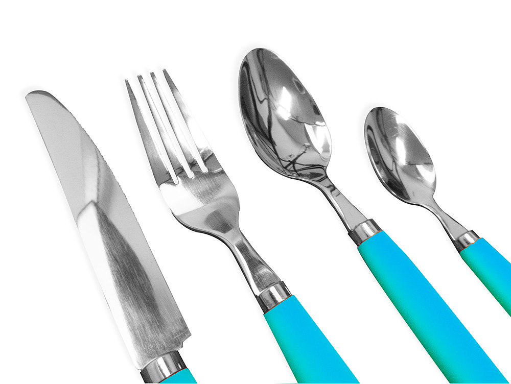 Een 16-delig bestekset bestaande uit 4 messen, 4 vorken, 4 lepels, 4 theelepels. Materiaal: ABS Soft Touch Finish, Edelstaal.