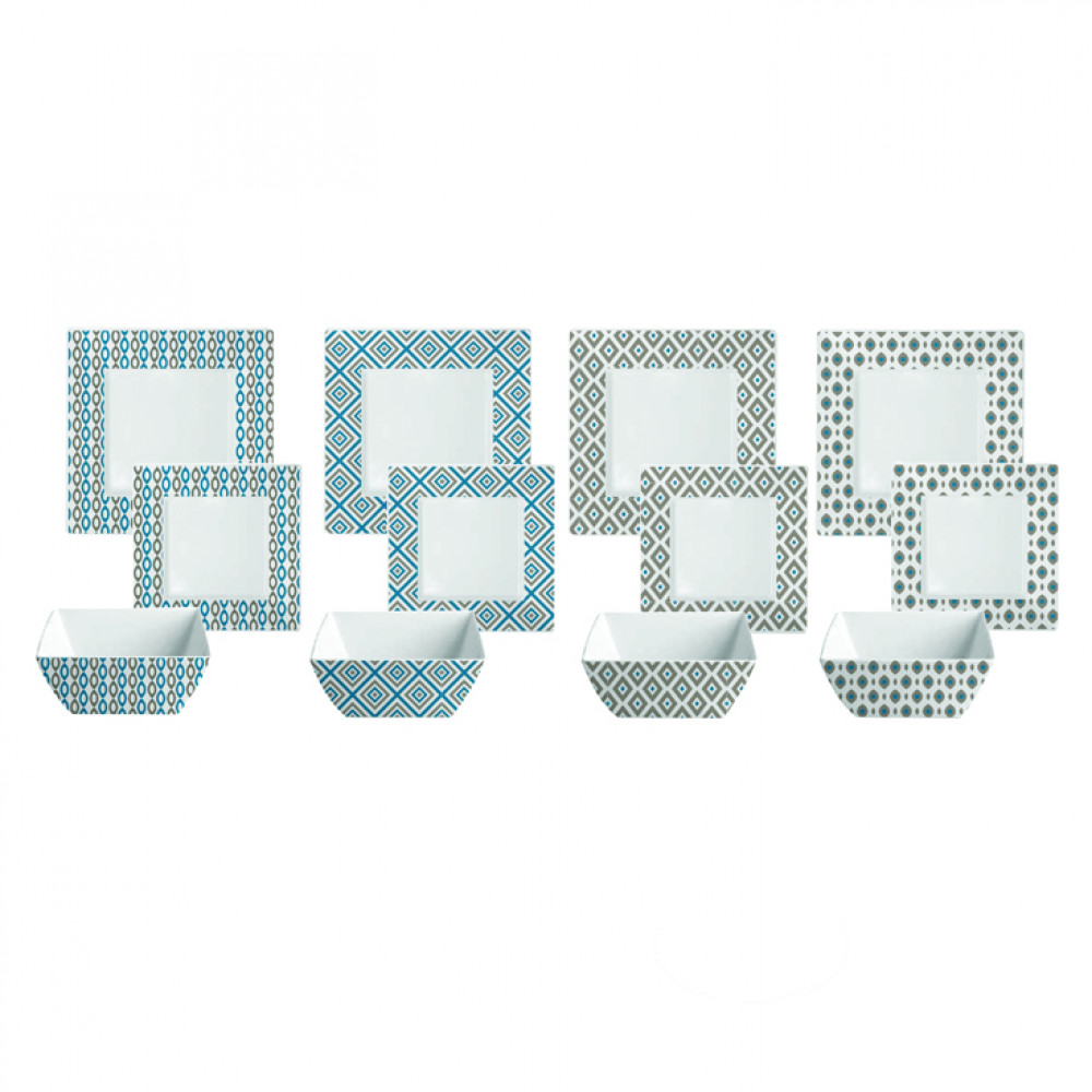 Melamine vierkant design servies van ViaMondo is sterk, licht van gewicht en onbreekbaar. Kan in de vaatwasser, niet in de magnetron. Dit 12-delig servies bestaat uit: 4 grote borden 25,4 cm, 4 kleine borden 20,7 cm, 4 schaaltjes 15 cm, 715 cl. Totale gewicht: 2,24 kg.