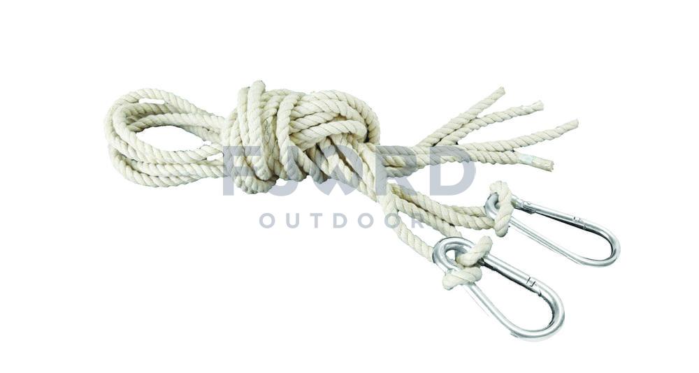 Handig touw voor hangmatten. Zorgt ervoor dat hang,atten overal kan worden opgehangen en helpt als bomen te ver uit elkaar staan. De set bestaat uit 2 touwen van 140 cm met metalen klem. Belastbaar tot 300 kg.
